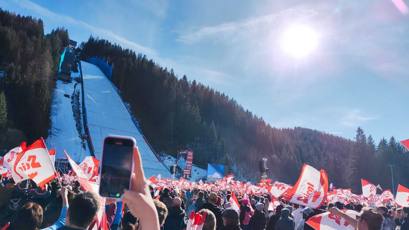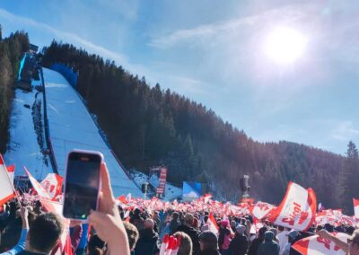 Vor Ort erwartete uns eine großartige Atmosphäre mit vielen Fans und beeindruckenden Flügen der Athleten auf der legendären Skiflugschanze.